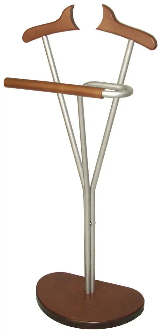 Эта серия напольных вешалок смотрится особенно эффектно, т.к. в моделях металл, окрашенный в цвет металлик, чрезвычайно эффетно сочетается с натуральным деревом, тонированным под орех. Особенно красиво в вешалках этой серии смотрятся массивные деревянные основания, выполненные в форме круга методом гнуто-клееного шпона, что придает вешалкам стильность и устойчивость. Такое сочетание материалов позволяет размещать вешалки в любом интерьере, имеющем хоть небольшой оттенок модернизма. высота-110 см, длина-44 см, ширина-28 см. Костюмная вешалка, материал-натуральное дерево в сочетании с металлом, цвет-среднекоричневый/металлик.