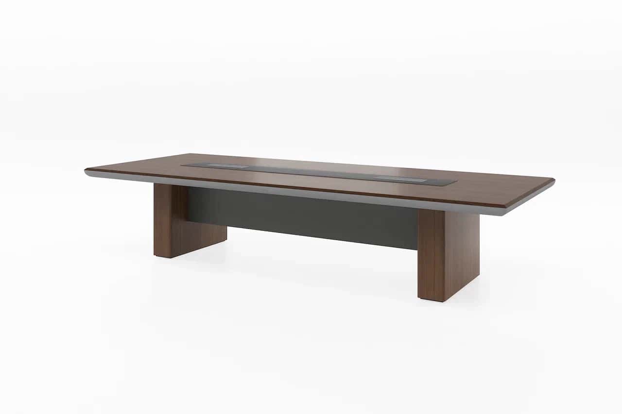 "Прямоугольный стол для совещаний со столешницей из шпона и деревянным основанием. В комплект входят два двусторонних откидных лючка с 4-мя розетками питания и 2 разъёмами для передачи данных. Канал для проводов в ножке."