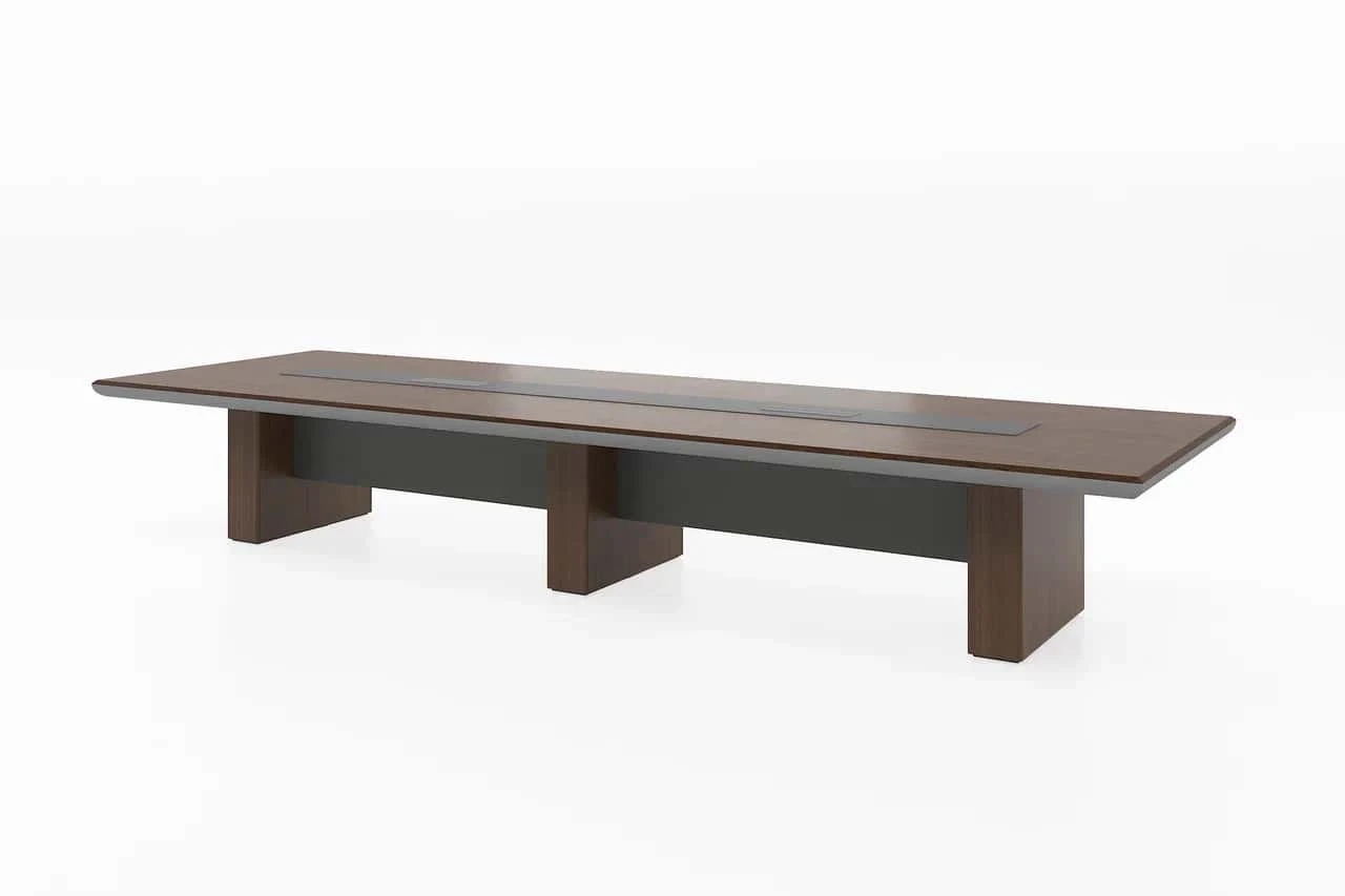 "Прямоугольный стол для совещаний со столешницей из шпона и деревянным основанием. В комплект входят два двусторонних откидных лючка с 4-мя розетками питания и 2-мя разъёмами для передачи данных. Канал для проводов в ножке."