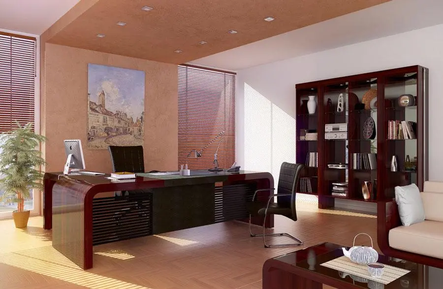 В кабинете Дао дизайнеры постарались на славу. Плавные линии столешниц, перетекающие в боковые опоры без единого шва. Оригинальные, контрастные места стыков приставных элементов к столешницам. Необычная задняя стена рабочего стола, напоминающая жалюзи. При этом вся мебель кабинета DAO покрыта натуральным шпоном (эбеновое дерево) и несколькими слоями высококачественного лака.