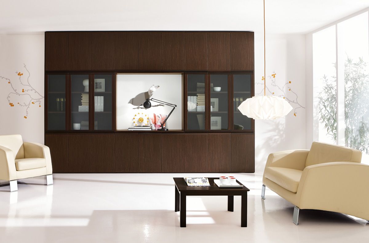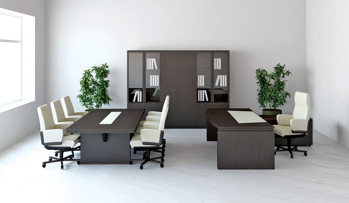 Кроме того, идею контрастного бювара в кабинете Еур продолжают столешницы брифинг-приставки и конференц-стола – они также имеют кожаные вставки, совпадающие по цвету с кожей на рабочем столе руководителя. Стоимость комплекта офисной мебели Eur зависит от выбранных элементов.