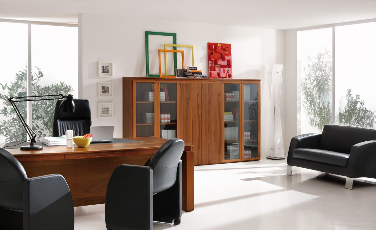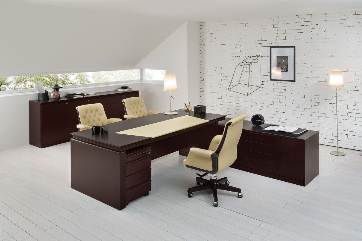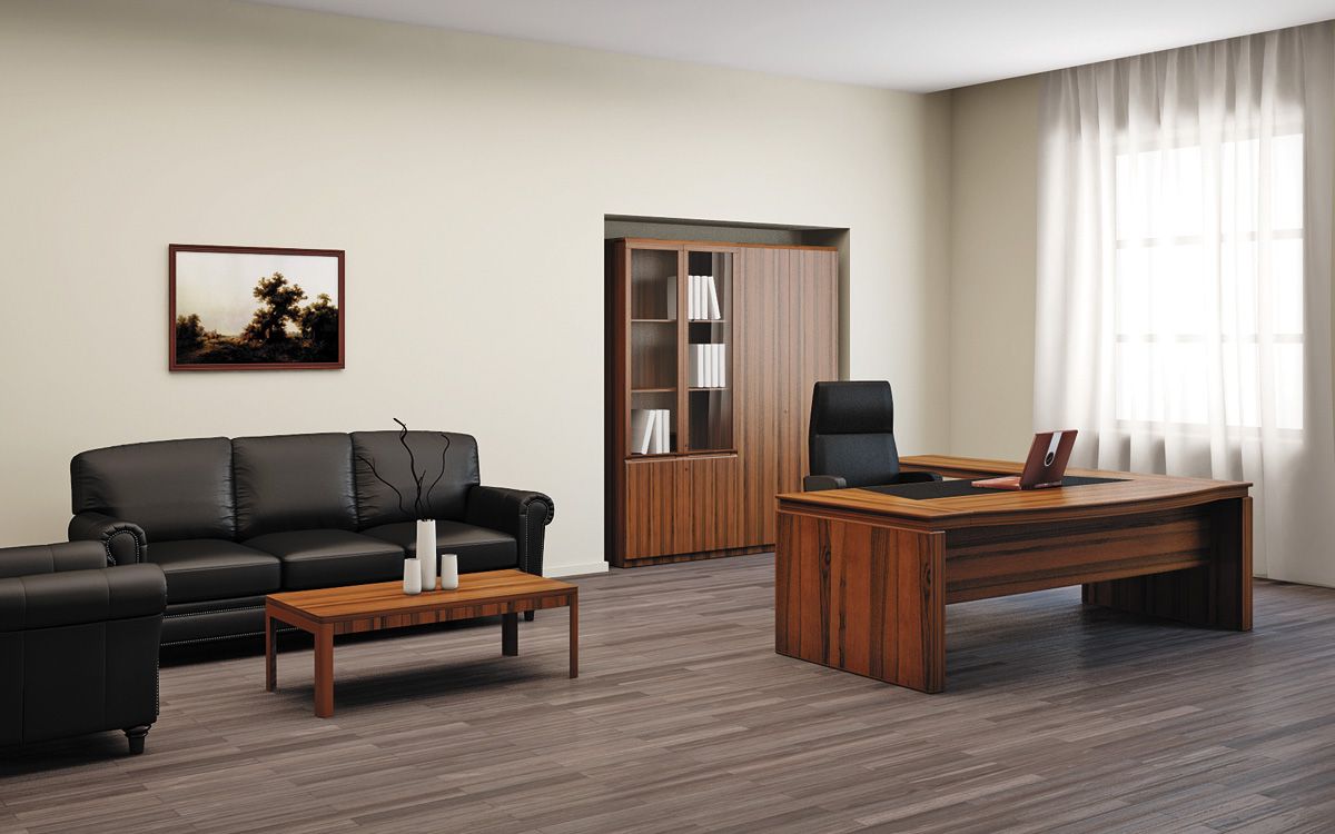 Все элементы данной серии есть в наличии и под заказ. Рабочий стол в кабинете Eur представлен двумя вариантами исполнения: классический и секторальный. И в том и другом имеется встроенный кожаный бювар, который контрастно выделяется на основном фоне мебели и обладает формой трапеции, направленной узкой частью к хозяину кабинета.