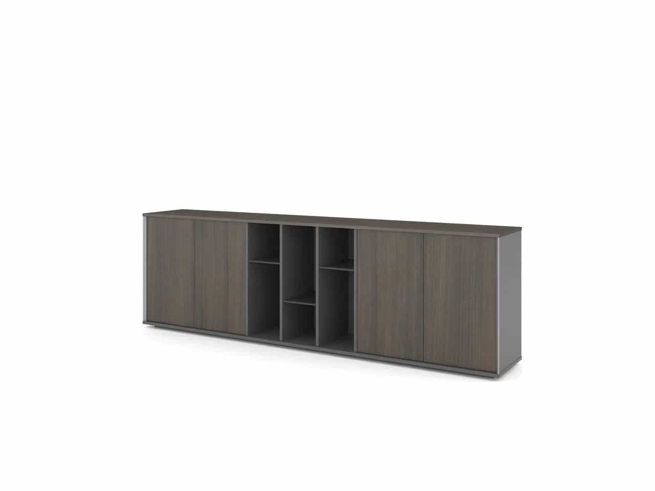 Низкая греденция с 4-мя раздвижными дверями. Открытые полки посредине.