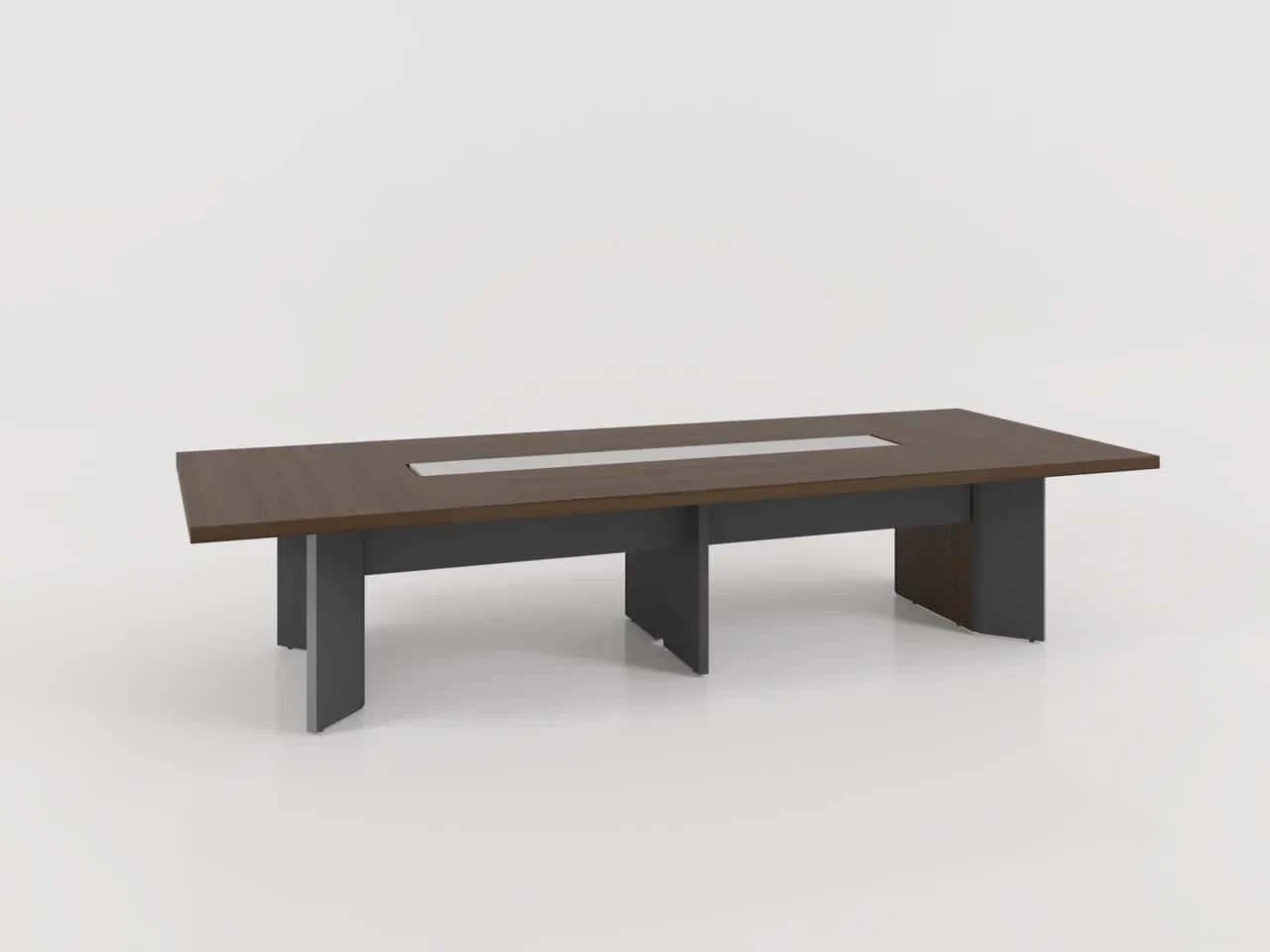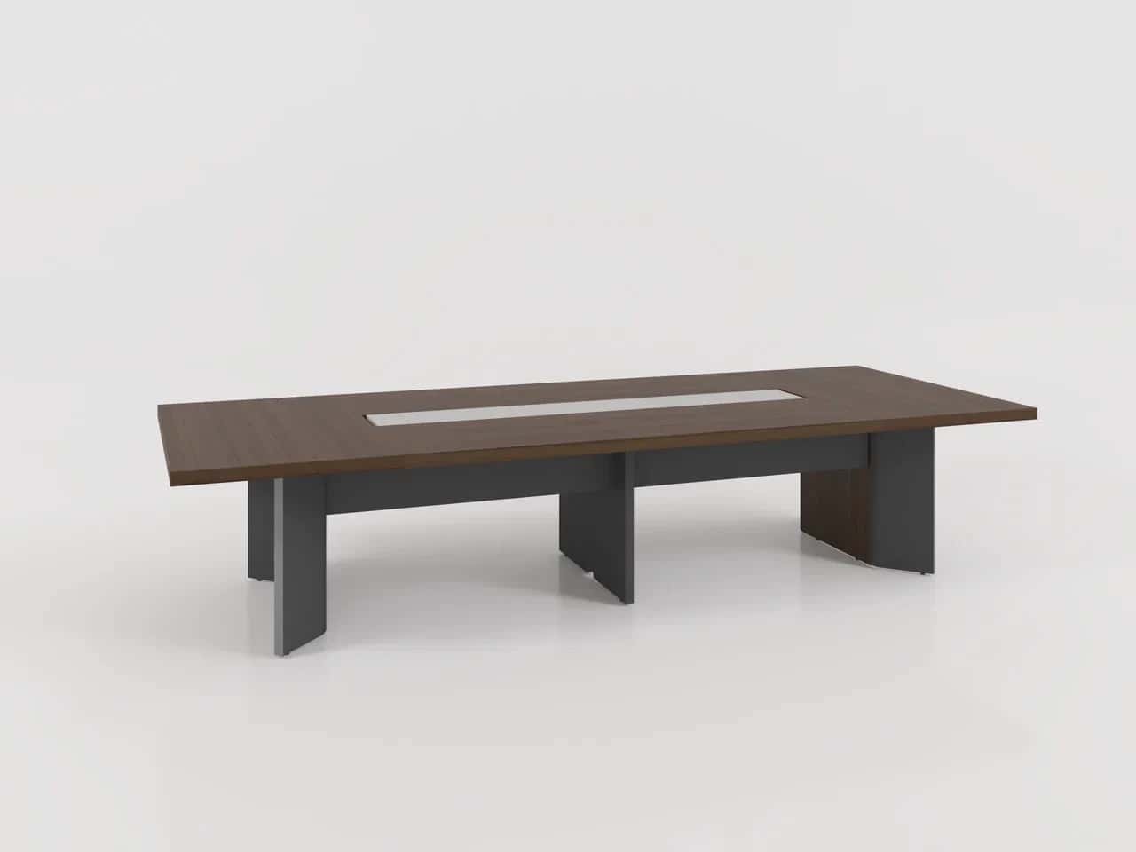Прямоугольный стол для совещаний со столешницей из шпона и деревянным основанием. Включает 2 розетки питания и 2 разъёма для передачи данных. Центральная ножка в качестве кабель-канала.