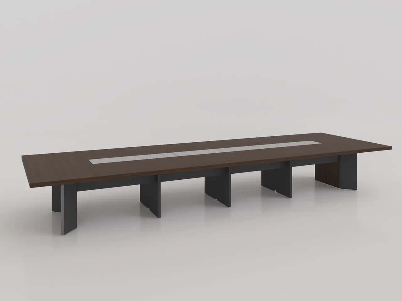 Прямоугольный стол для совещаний со столешницей из шпона и деревянным основанием. Включает 4 розетки питания и 4 разъёма для передачи данных. Центральная ножка в качестве кабель-канала.