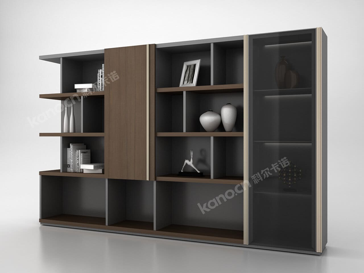 Шкаф для документов с меламиновой отделкой. В комплекте деревянная дверца с алюминиевыми ручками стеклянная дверца в алюминиевой рамке с полноразмерной алюминиевой ручкой