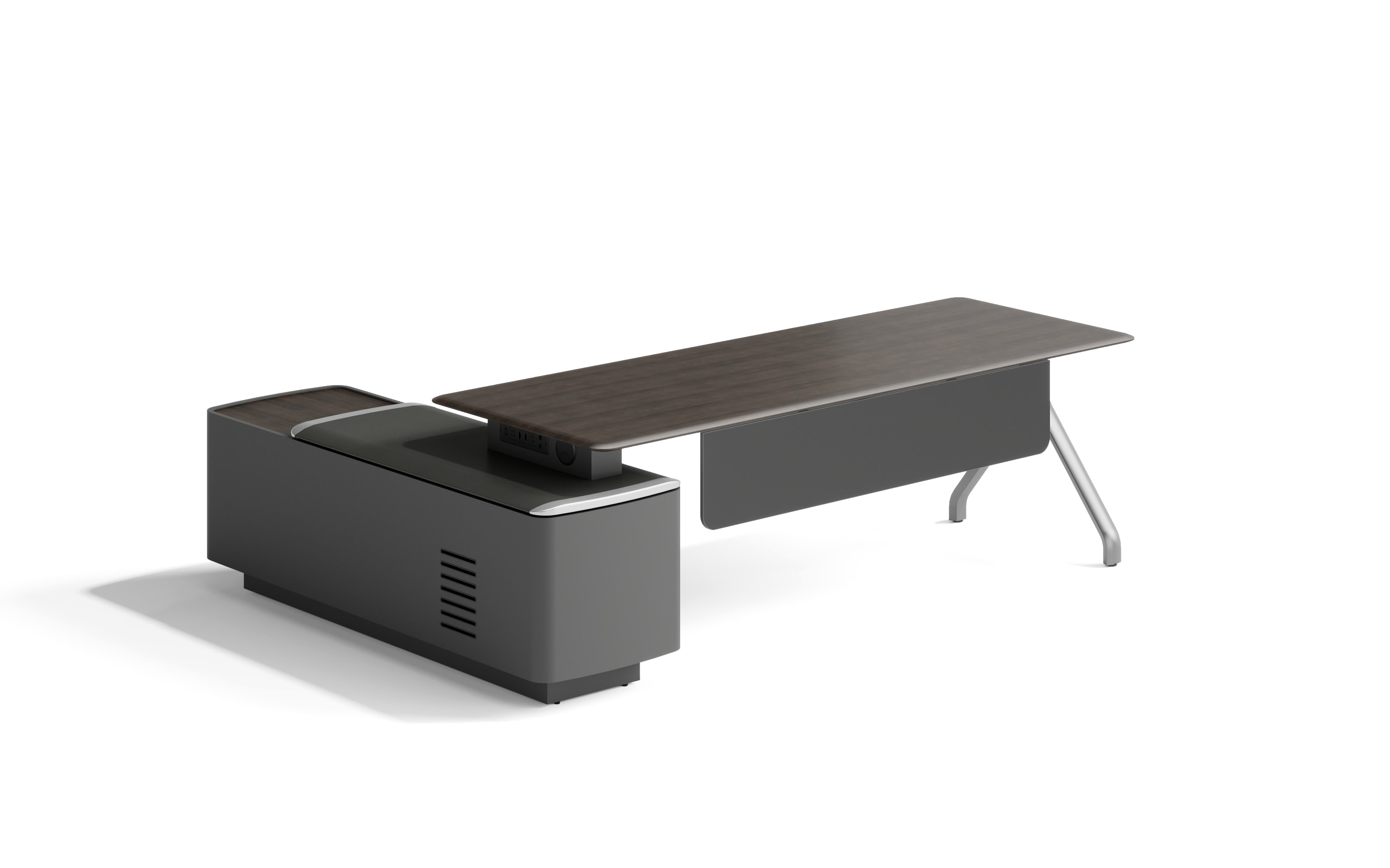 "L-образный стол для персонала с ножками из алюминиевого сплава и фиксированным боковым местом для хранения вещей. В комплект входит врезной розеточный блок: 2 розетки питания и 1 розетка для передачи данных, механический кодовый замок, направляющая DTC, шарнир DTC, кожаная ручка."