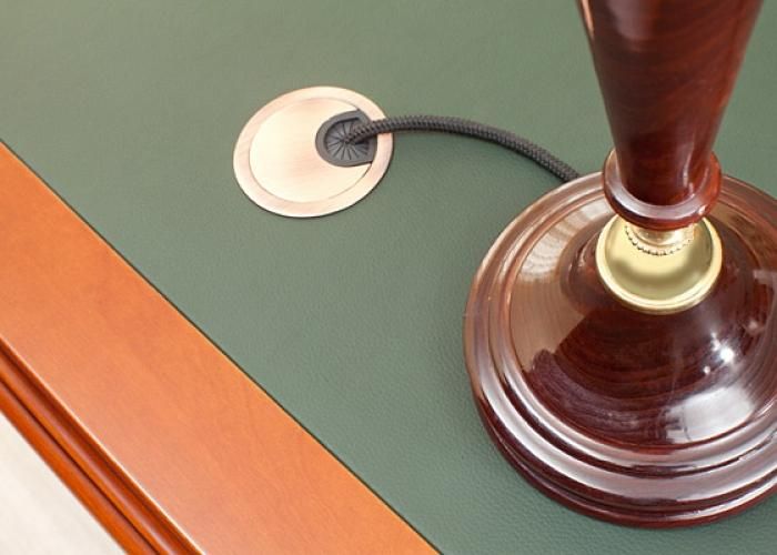 Совершенно естественно смотрятся и элементы мебели, относящиеся уже к нашему веку: выдвижная доска под клавиатуру и заглушки отверстий под провода на столешницах, поскольку они стилизованы под общую эстетику кабинета.