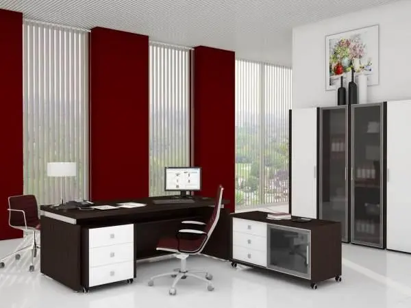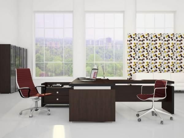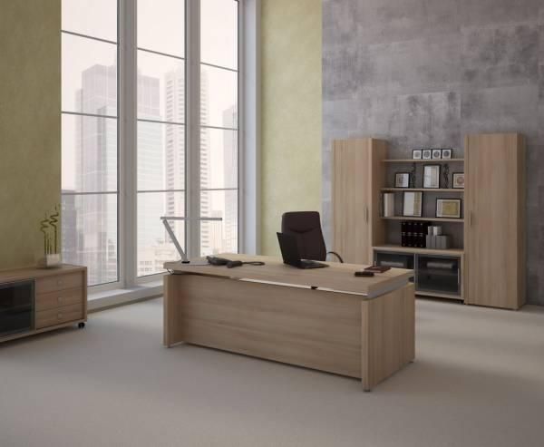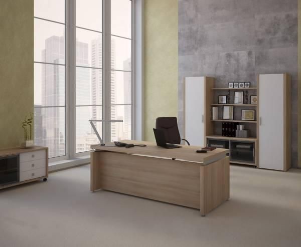 В коллекции имеется несколько вариантов решений для стола руководителя, приставные мобильные тумбы, брифинг-приставки и конференц-стол, а также несколько различных шкафов для документов и гардероб.