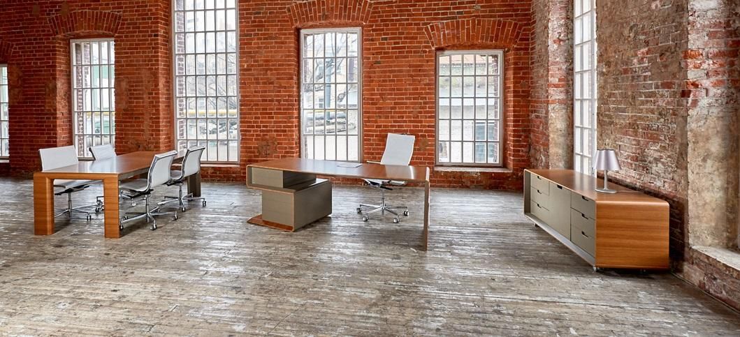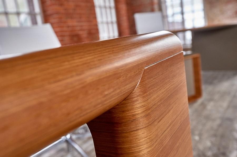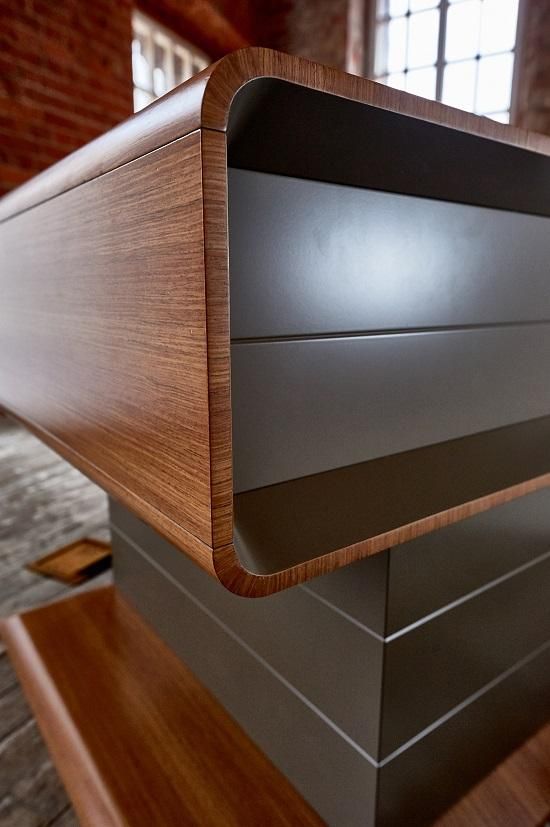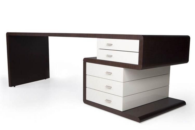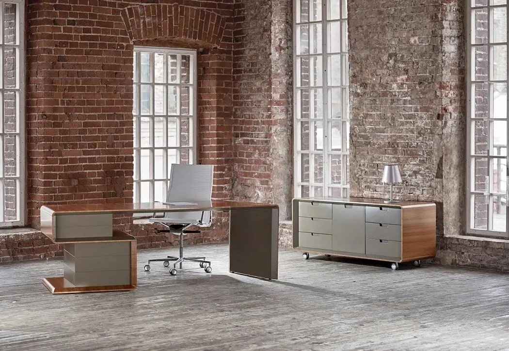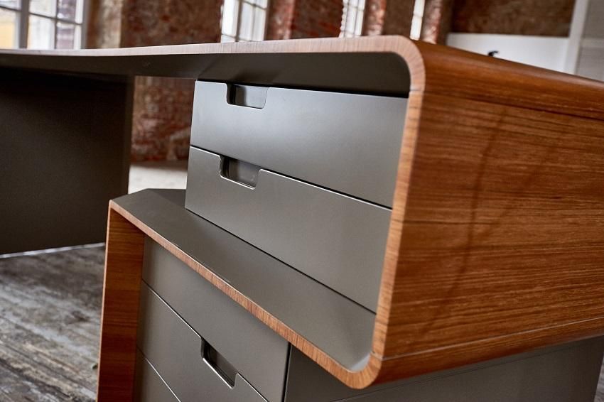 Плавные изгибы, дополненные системой хранения документации. В основном ящики открываются с помощью легкого нажатия на створки, а также на них могут быть установлены кожаные ручки. Некоторые модели оборудованы врезными ручками, соответствующие по дизайну общей концепции. Одной из особенностей данной серии являет то, что выдвижные ящики стола выходят отдельными блоками, создавая пустое пространство, которое имитирует невесомость. Все элементы мобильны и практичны. Работать за таким гарнитуром одно удовольствие.
