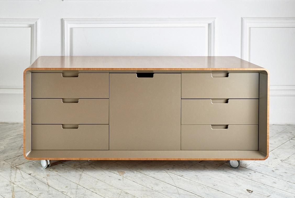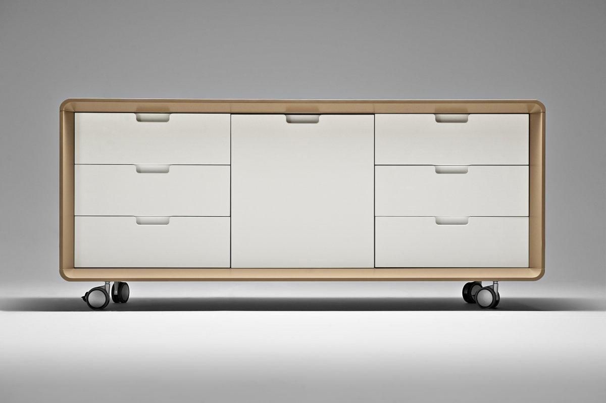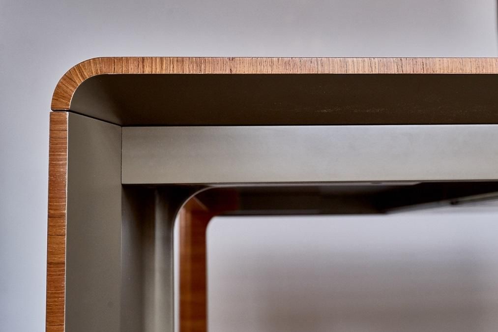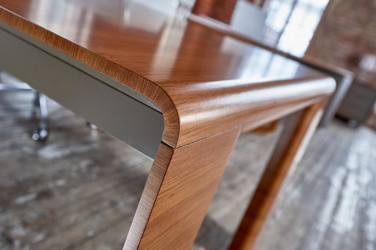 Плавные изгибы, дополненные системой хранения документации. В основном ящики открываются с помощью легкого нажатия на створки, а также на них могут быть установлены кожаные ручки. Некоторые модели оборудованы врезными ручками, соответствующие по дизайну общей концепции. Одной из особенностей данной серии являет то, что выдвижные ящики стола выходят отдельными блоками, создавая пустое пространство, которое имитирует невесомость. Все элементы мобильны и практичны. Работать за таким гарнитуром одно удовольствие.