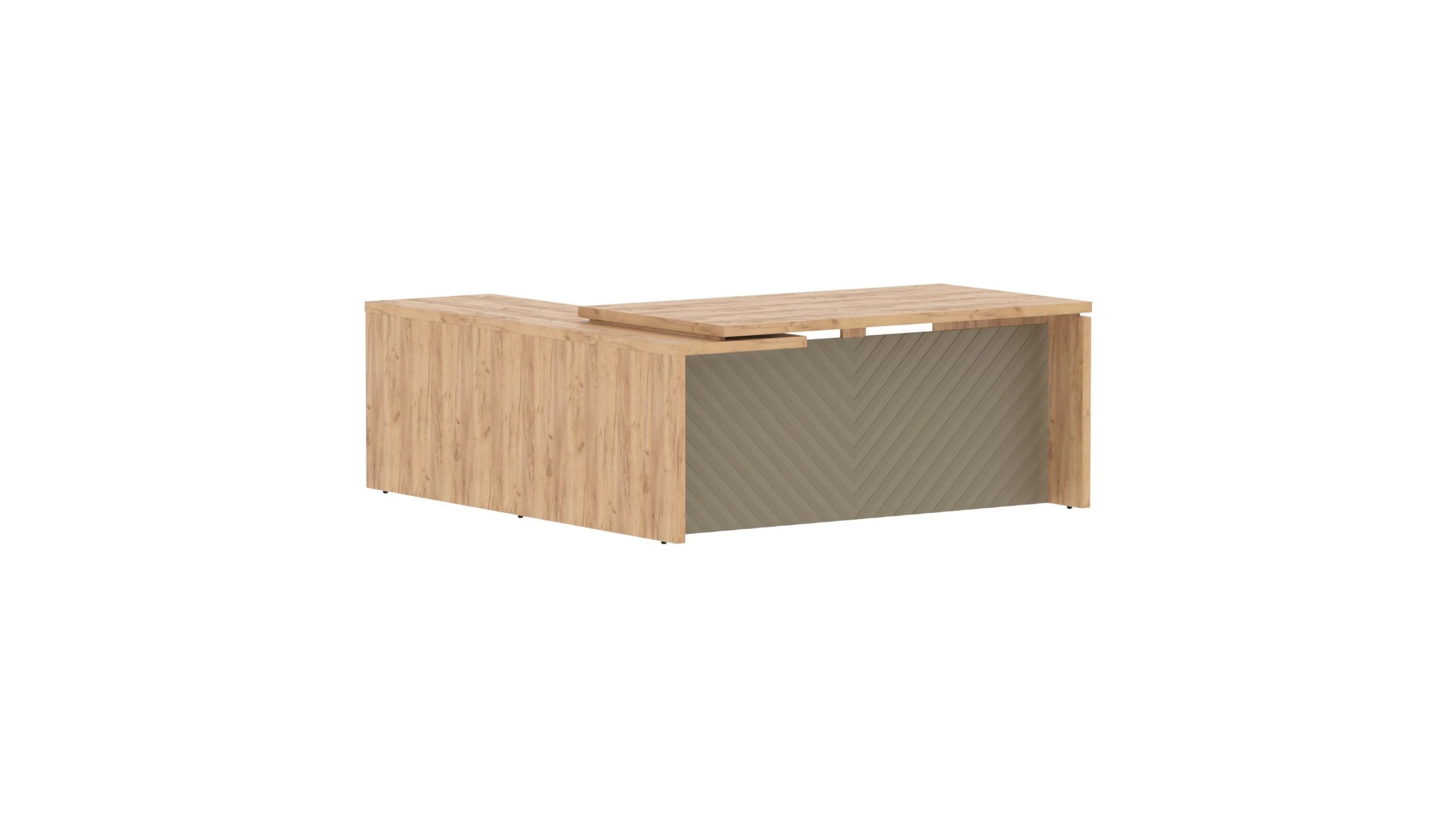 Столешница и опоры из ЛДСП толщиной 38мм с кромкой ПВХ т.2мм в цвет ЛДСП. Стол комплектуется регулируемыми опорами. Фронтальная панель из одностороннего МДФ т.19мм фрезерованного крашенного матовой эмалью, высотой до пола h=640мм.