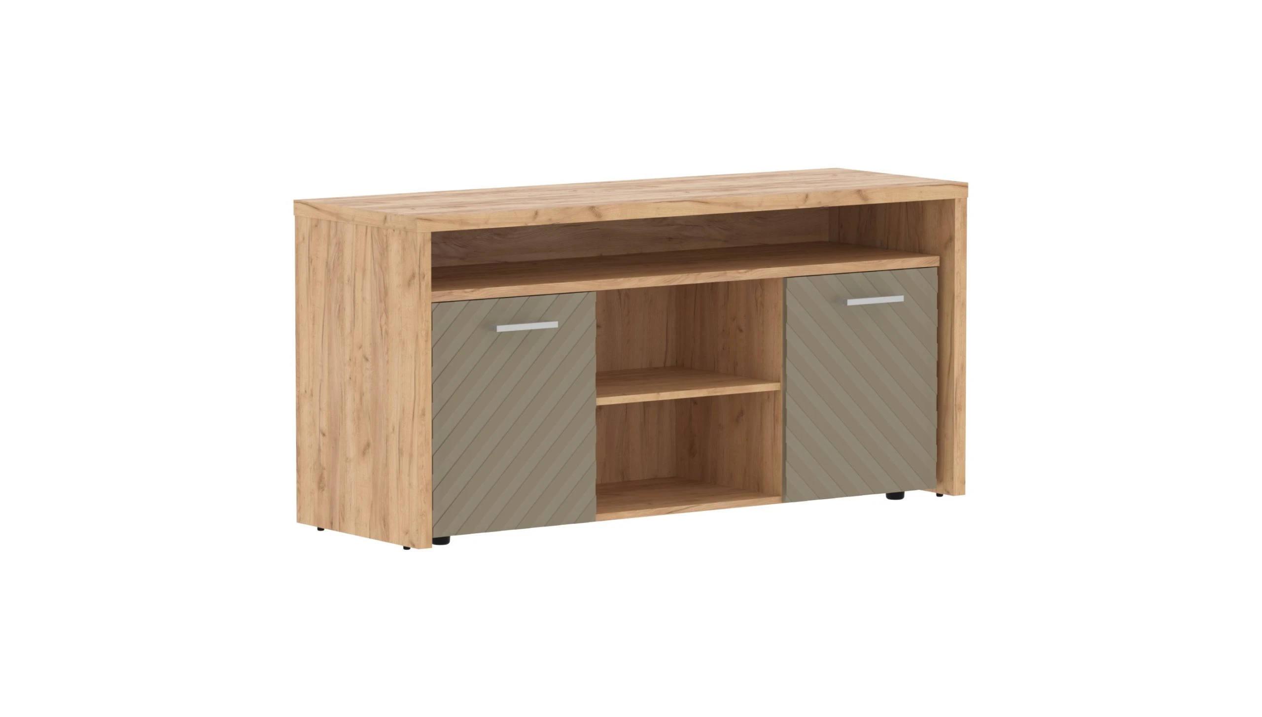 Столешница и опоры из ЛДСП толщиной 38мм с кромкой ПВХ т.2мм в цвет ЛДСП. Стол комплектуется регулируемыми опорами. Фронтальная панель из одностороннего МДФ т.19мм фрезерованного крашенного матовой эмалью, высотой до пола h=640мм.
