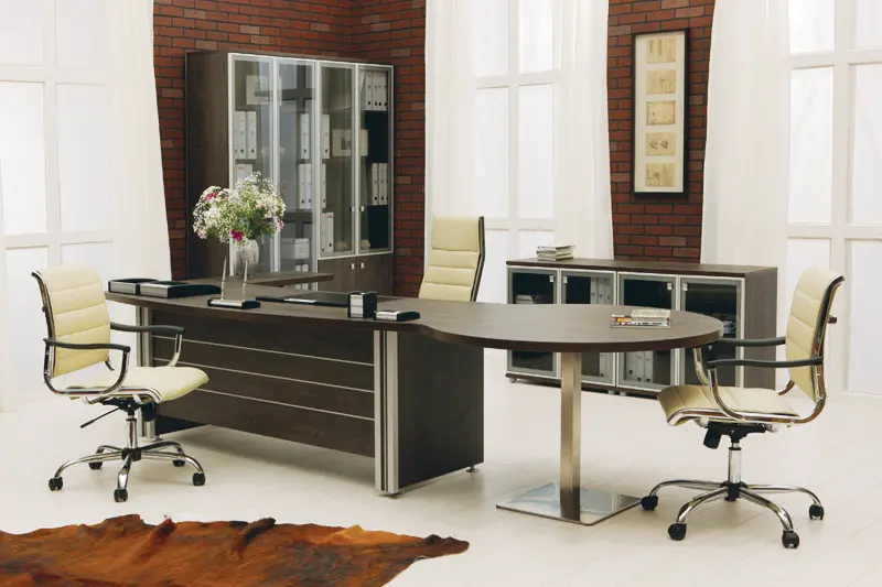 Из особенностей кабинета Васанта, стоит обратить внимание на оригинальные решения журнального стола, стола для переговоров и малого конференц-стола – их формы необычны и оригинальны. А из важных моментов, учитывайте, что в приставной тумбе предусмотрено место для сейфа, который скрывается за дверцей-жалюзи.
