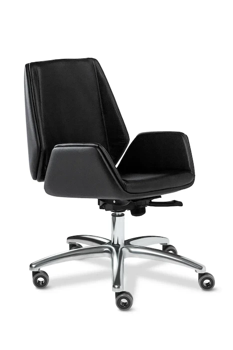 Кресла модели Siena - это прекрасный выбор для наполнения офисных пространств, сочетают в себе классическую форму, практичность и приятную эргономику. Кресло для посетителя Siena B - выполняется с низкой спинкой, на литой крестовине из полированного алюминия. Дизайн кресла лаконичен, сочетает в себе строгость и элегантность. Кресло оборудовано механизмом качания с регулировкой под вес и фиксацией в четырёх положениях - "Мультиблок" (может быть укомплектовано и другими механизмами такими как - "Топган" и Топган-Люкс"), а так же регулировкой высоты за счет установленного в крестовине кресла газо-масляного амортизатора (газпатрона) 3-ей категории стабильности (DIN 4550 class 3), категория повышенной надёжности: газпатрон выдерживает нагрузку в 200 тысяч циклов при динамической стендовой нагрузке в 80 кг. Минимальное давление, при котором срабатывает газпатрон - 21,5 кг, максимальное - около 150 кг. Толщина поролона на сиденье и на спинке 50 мм. Применяемая марка поролона 30/40 и 40/60 (плотность/жесткость) обеспечивает долговечность кресла. Каркас кресла выполнен из гнутоклееной фанеры в виде ковша. Толщина каркаса - 17 мм. Чехол кресла выполнен из черной или цветной мебельной, натуральной кожи сквозного крашения со среднезернистым тиснением из цельных шкур крупного рогатого скота, задняя часть спинки по евростандарту из кожзама (компаньона) в цвет кожи. Толщина шкуры в стандартной точке 0,9-1,1мм. Также чехол может быть выполнен из экокожи ("Орегон") или микровелюра, вельвета. Чехол кресла состоит из двух частей - сидения и спинки, без утяжек и строчек, имеет стильную окантовку-прострочку по кругу. Все указанные материалы экологичные и износостойкие. Подлокотники кресла из гнутоклеенной фанеры, являются частью сидения, состоят из верхней-рабочей и нижней части. Верхняя часть с внешней стороны имеет мягкую накладку-подушку из поролона, обтянутую натуральной кожей. Нижняя часть по евростандарту из кожзама (компаньона) в цвет кожи. Крестовина кресла - литая, выполнена из полированного алюминия, выдерживает нагрузку до 150 кг. Ролики - паркетные прорезиненные (обеспечивают сохранность паркета, ламината). Каждый ролик рассчитан на нагрузку в 30 кг.