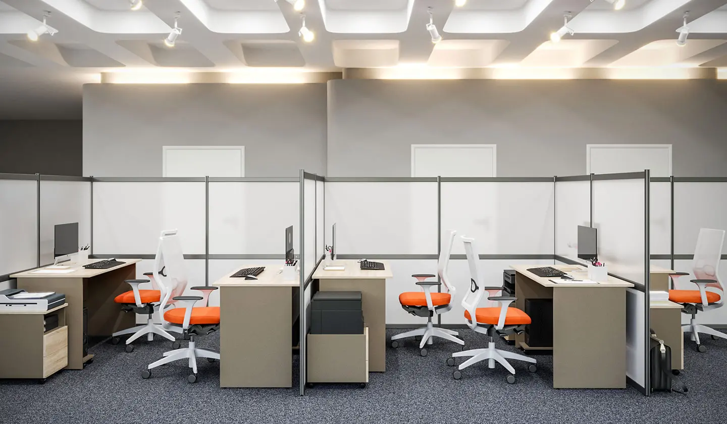 - Перегородки выполнены из алюминиевого каркаса и заполнения из ЛДСП, матового акрила или панелей с тканевой обивкой. В зависимости от стиля офисного помещения и специфики работы сотрудников предусмотрены четыре варианта наполнения перегородок: однородное или комбинированное из ЛДСП, комбинированное из ЛДСП и матового молочного акрила и комбинированное из ЛДСП и мягких текстильных панелей.