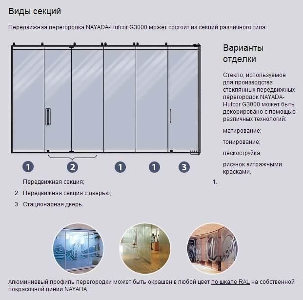 - В секции перегородки могут быть встроены двери. Двери могут быть установлены как стационарно, так и вмонтированы в передвижную секцию перегородки.